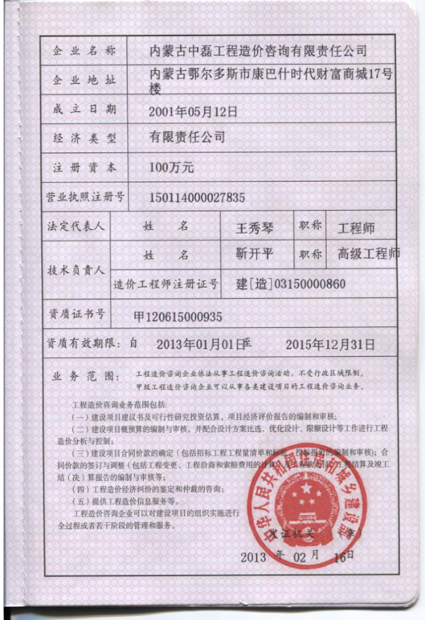內(nèi)蒙古中磊工程造價咨詢有限責任公司(隸屬于內(nèi)蒙古中磊集團),于2004年5月19日由內(nèi)蒙古自治區(qū)工商行政管理部門批準成立(注冊號:150114000027835),法定代表人:王秀琴,資質(zhì)等級為甲級(證書編號:甲120615000935),公司辦公地點位于鄂爾多斯市東勝區(qū)達拉特南路36號樓,公司現(xiàn)有專業(yè)技術(shù)人員52人,其中:注冊造價工程師11人、中級預(yù)算員及專業(yè)技術(shù)人員35人(其中:高級工程師5人,工程師20人)、管理及工勤人員6人,設(shè)有六個審計項目部。業(yè)務(wù)范圍包括:項目可行性研究投資估算及經(jīng)濟評價報告的編制和審核;建設(shè)工程預(yù)算、結(jié)算、竣工結(jié)(決)算編制和審核;工程招標標底、投標報價的編制和審核;建設(shè)項目工程價款的確定(合同價款的簽訂和調(diào)整);提供建設(shè)項目實施階段的工程造價監(jiān)控及工程索賠業(yè)務(wù)的咨詢服務(wù);工程造價經(jīng)濟糾紛的鑒定和仲裁的咨詢。