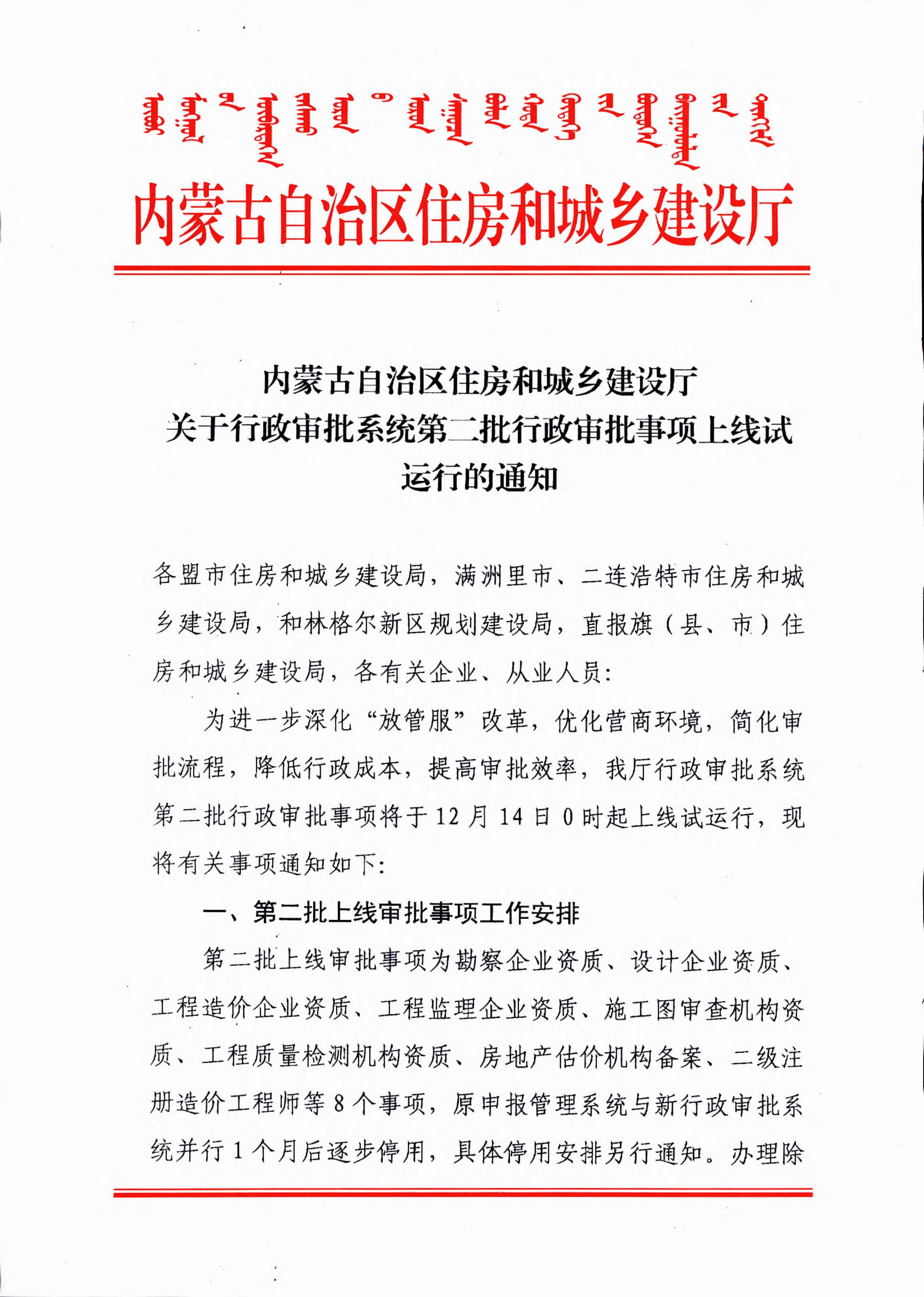 內(nèi)蒙古自治區(qū)住房和城鄉(xiāng)建設(shè)廳關(guān)于行政審批系統(tǒng)第二批行政審批事項(xiàng)上線試運(yùn)行的通知